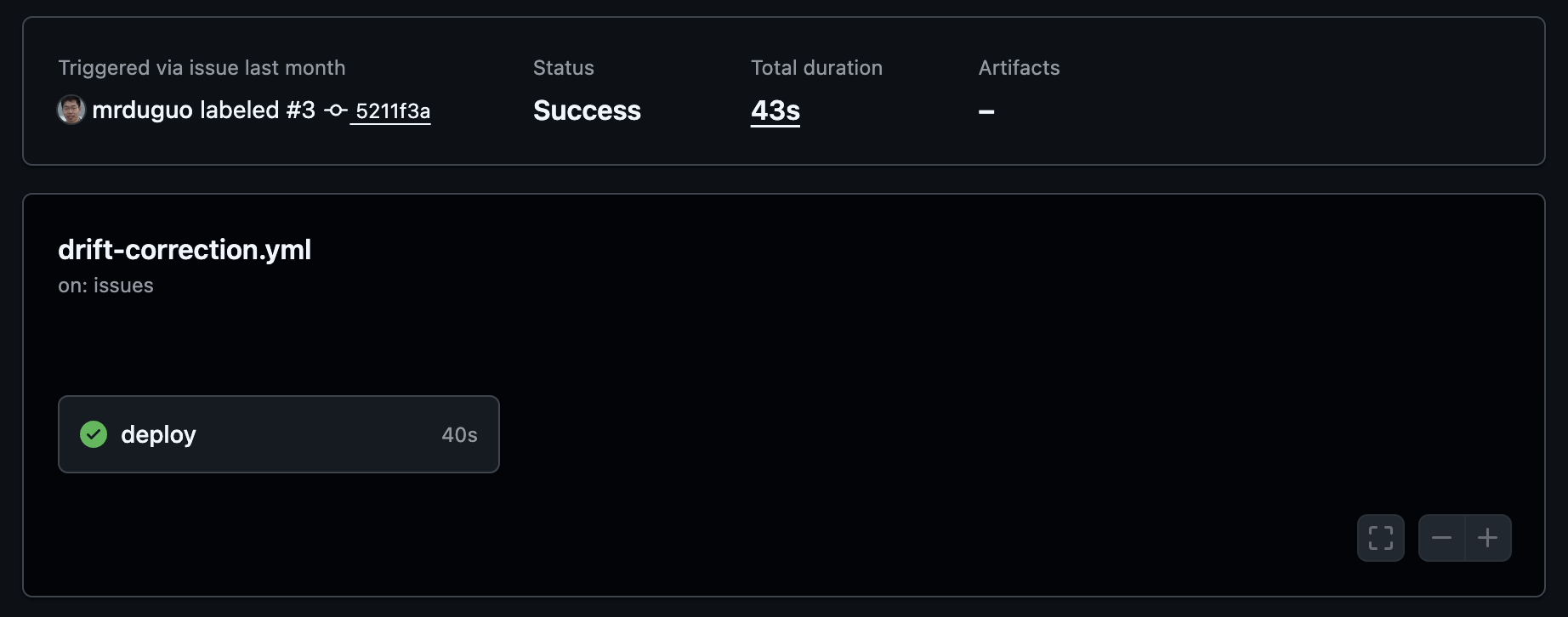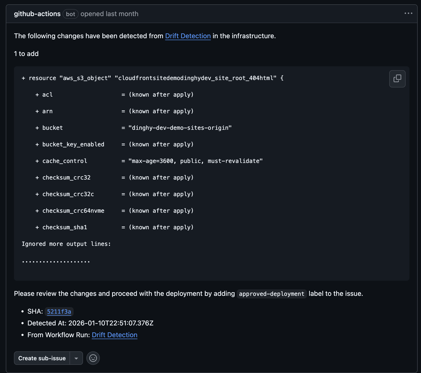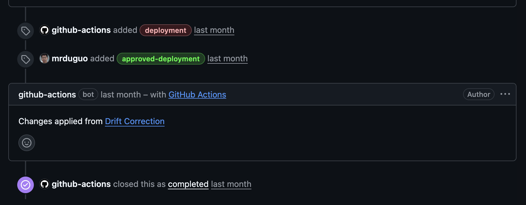 After you add the approved-deployment label to the issue, the Drift Correction workflow will be triggered: