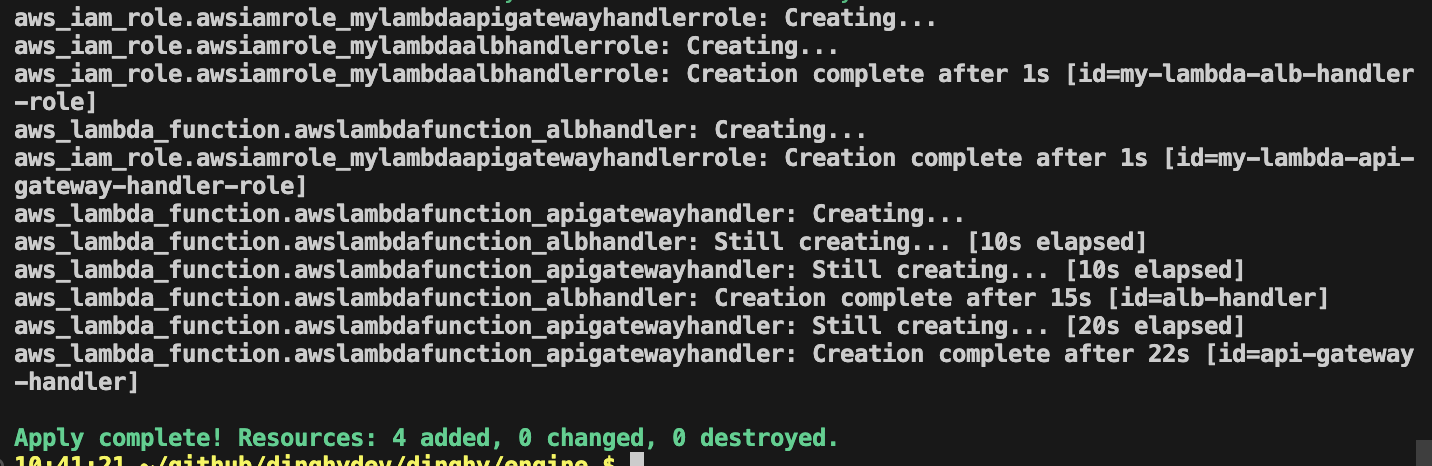 To test your newly deployed Lambda functions, use the dinghy aws command.