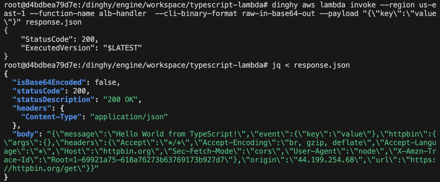 dinghy aws lambda invoke --function-name alb-handler --region us-east-1 --cli-binary-format raw-in-base64-out --payload "{\"key\":\"value\"}" response.json