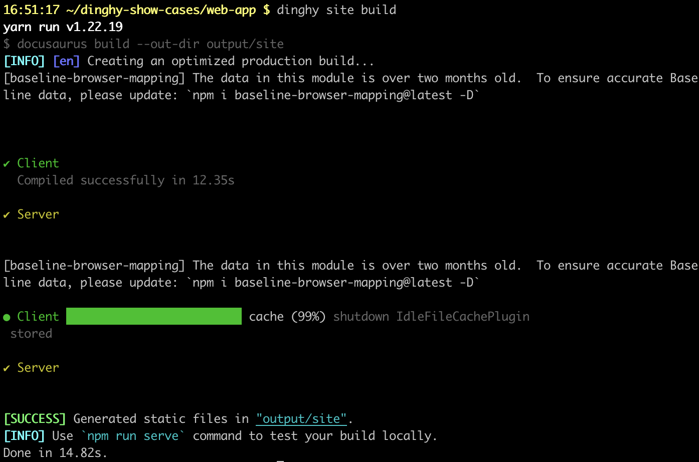Run dinghy site build to build static distributable site.