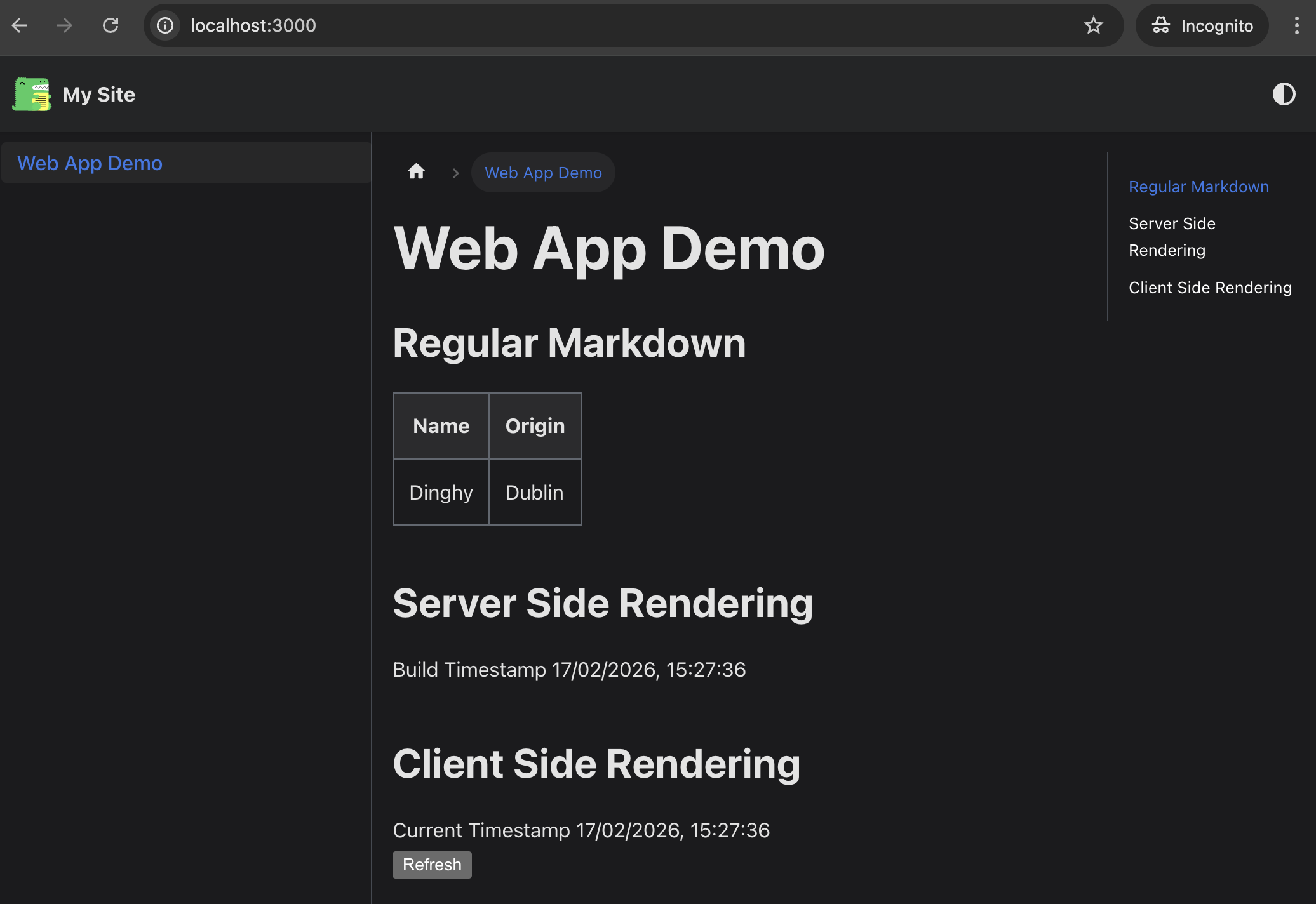 Published site at https://cloudfront-site-demo.dinghy.dev/demo-app-site/